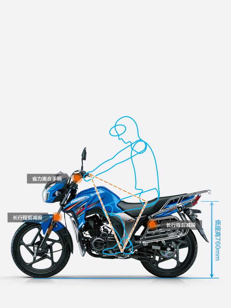 根据人机工程学原理,手把加高、座垫降低、搁脚前移,让骑乘坐姿轻松自然,腰背更舒坦;座垫高度低至760mm,遇到上下班高峰等复杂交通临时停车,即使身材不高,双脚也能轻松着地,驾乘更安心。