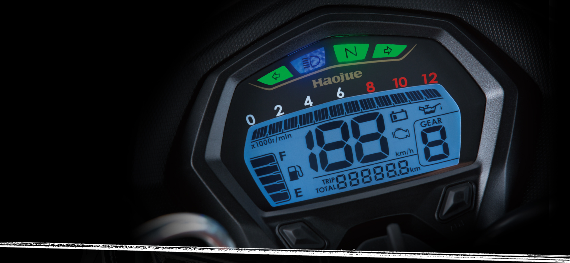 超大液晶显示屏,动感格段式转速表及五段数码油位显示,并具有MI故障指示器、电压警示、机油更换提示等功能,即时信息,尽在掌控。